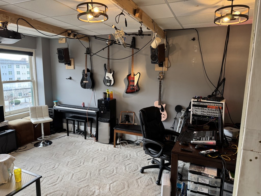 Walk in to excellent lighting and sound control in our comfortable 10’x10′ recording booth.